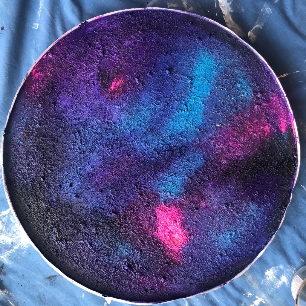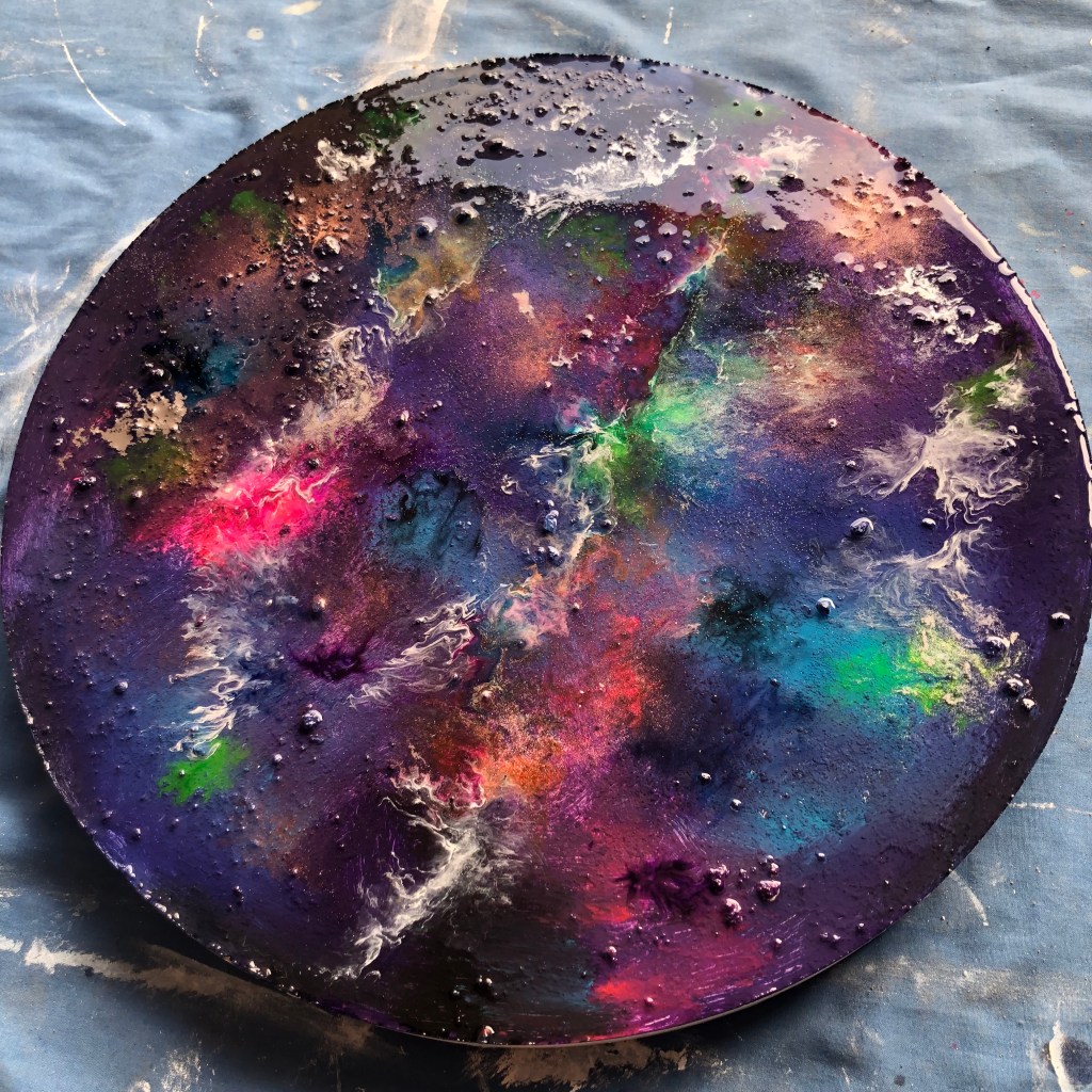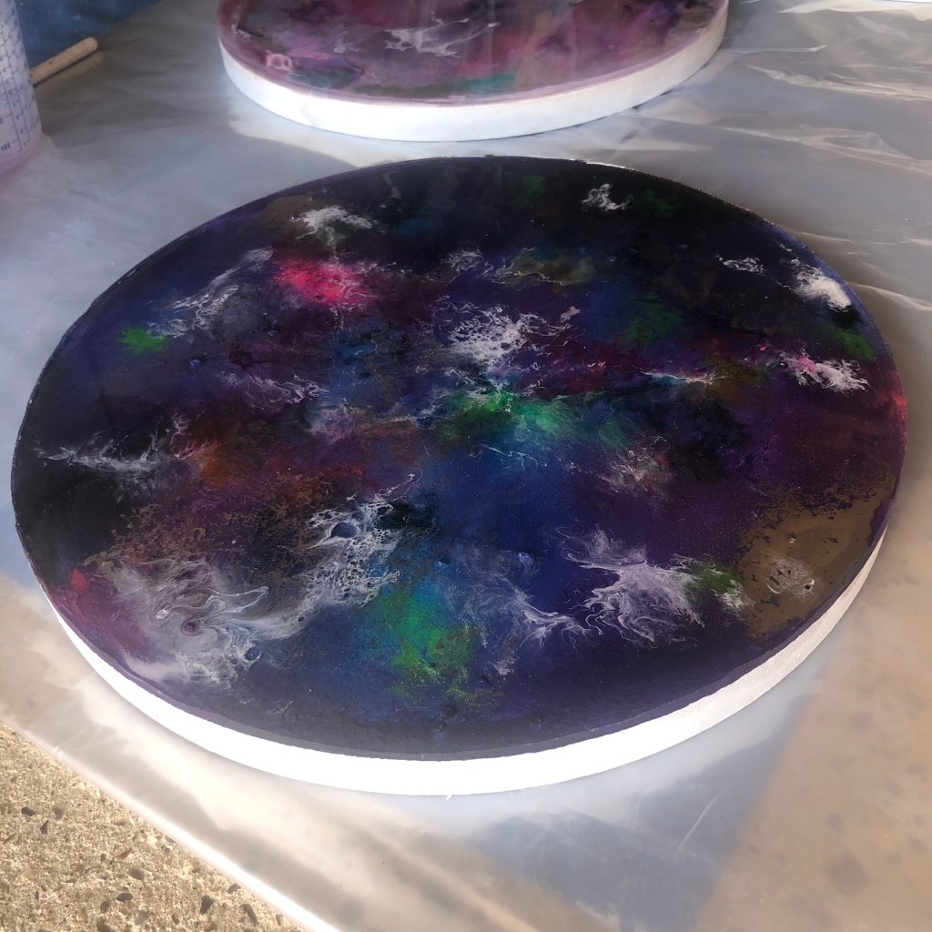 I am proud to introduce ‘Altitude’…a 40cm diameter circular wooden panel. 4 layers of resin and alcohol ink. Small amounts of glitter have been added at various stages of the layering process. A complete one-off original that has very occasional textures / imperfections visible that pierce through at surface level.