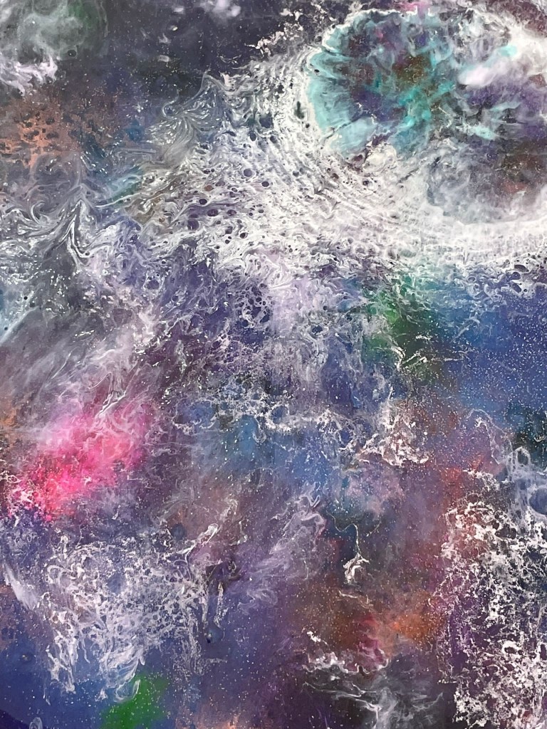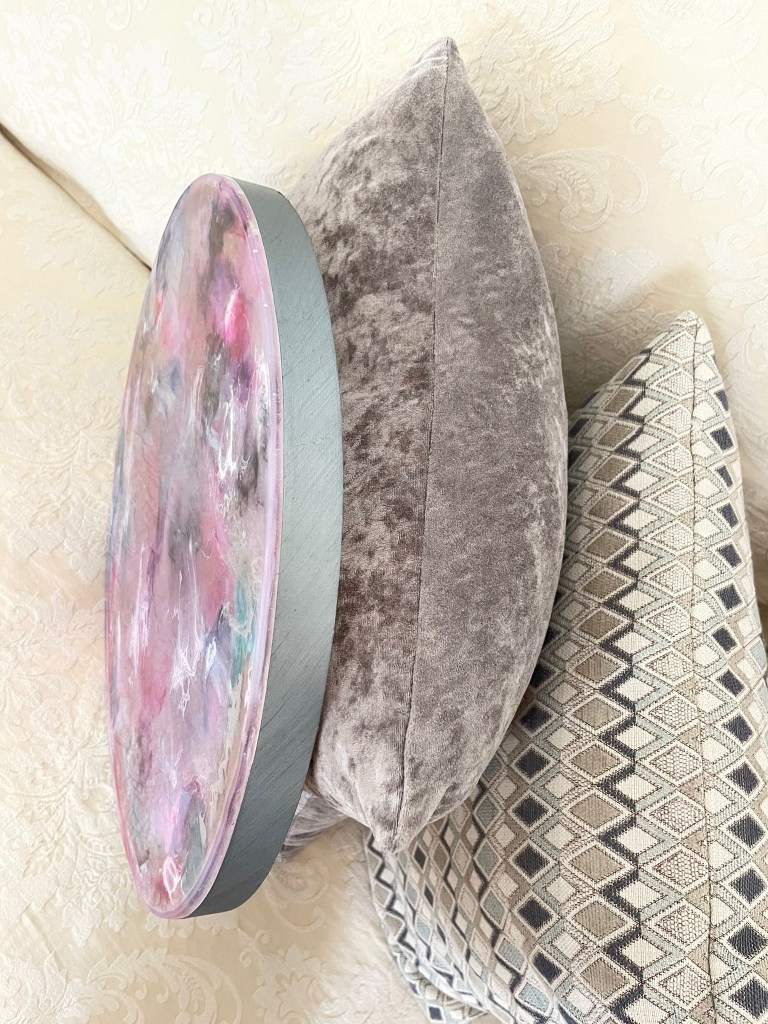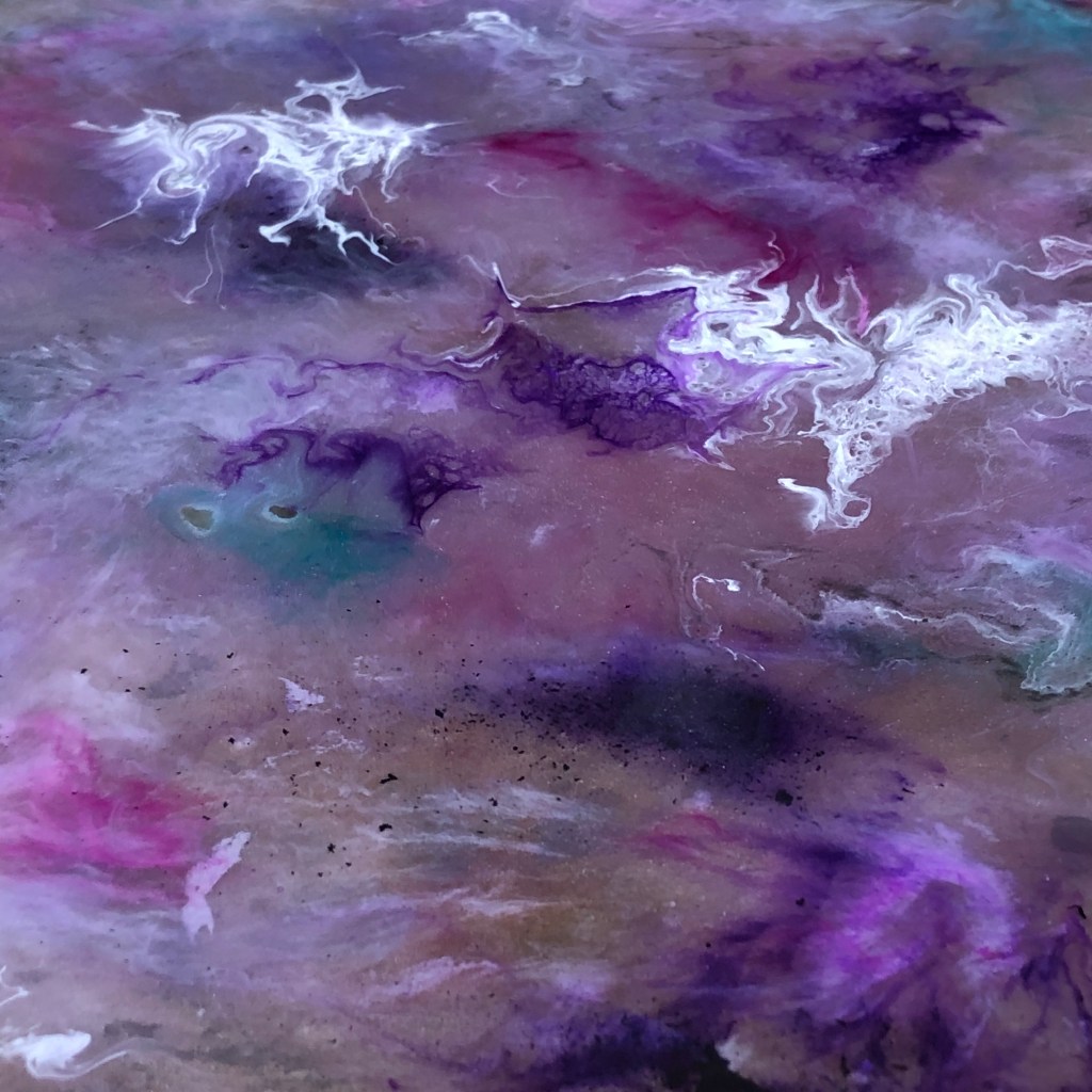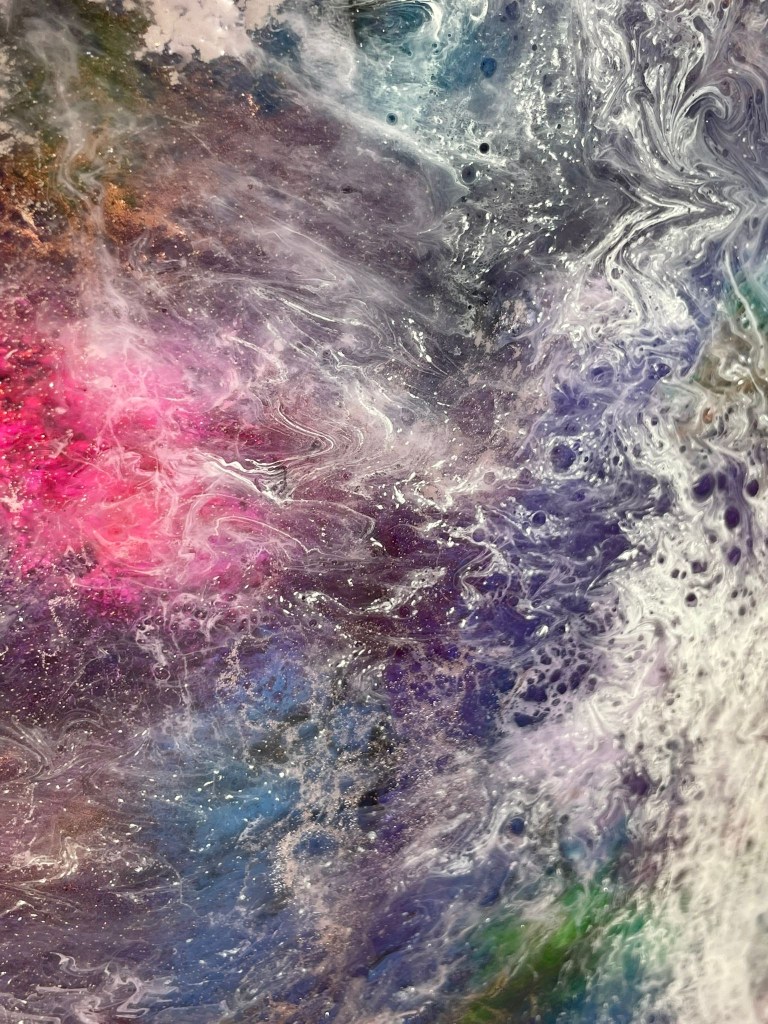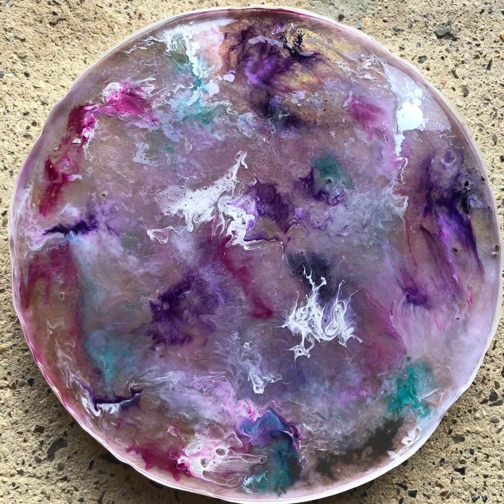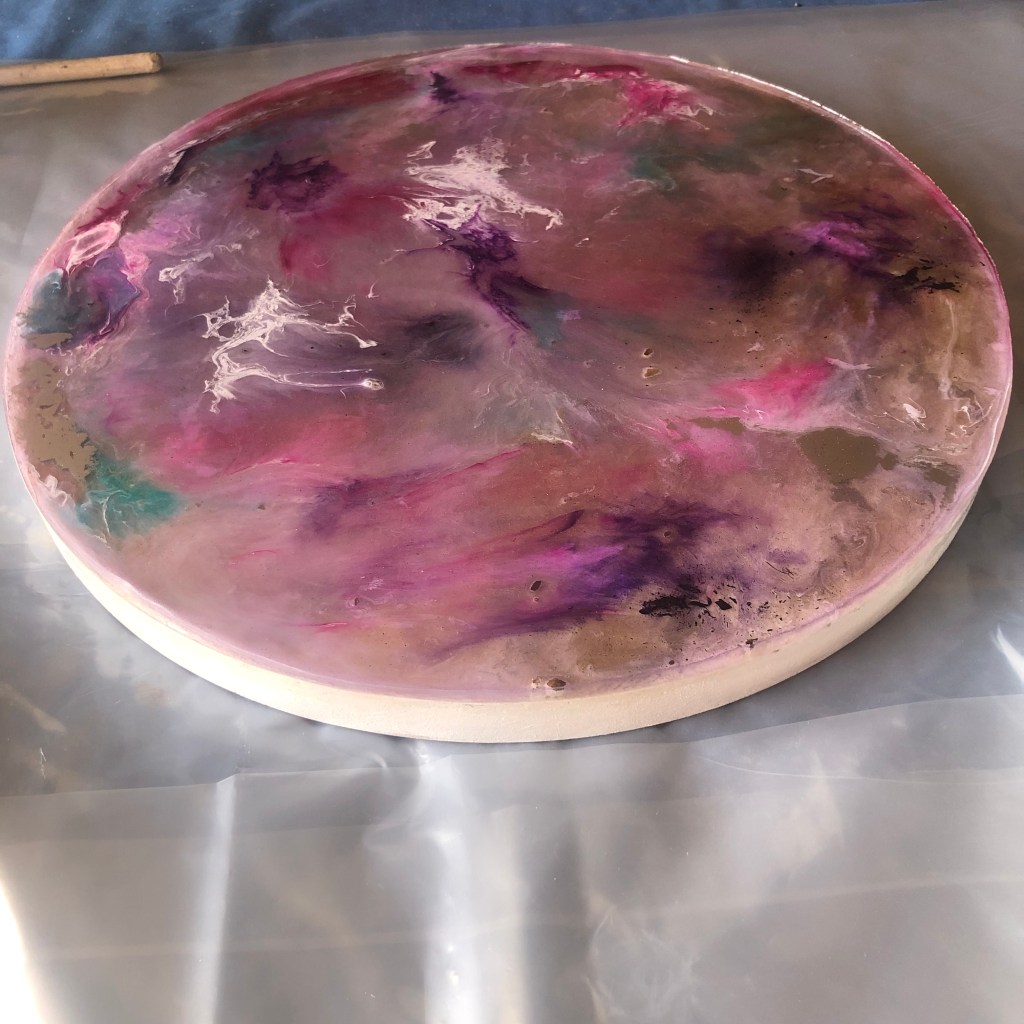 I am proud to introduce ‘Allure’…a 40cm diameter circular wooden panel. 4 layers of resin and alcohol ink. Small amounts of glitter have been added at various stages of the layering process. A complete one-off original that has very occasional textures / imperfections visible that pierce through at surface level. This was my final piece…