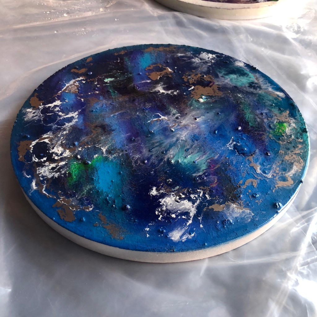I am proud to introduce ‘Azure’…a 40cm diameter circular wooden panel. 2 layers of resin and alcohol ink. Small amounts of glitter have been added at various stages of the layering process. A complete one-off original that has very occasional textures / imperfections visible that pierce through at surface level.